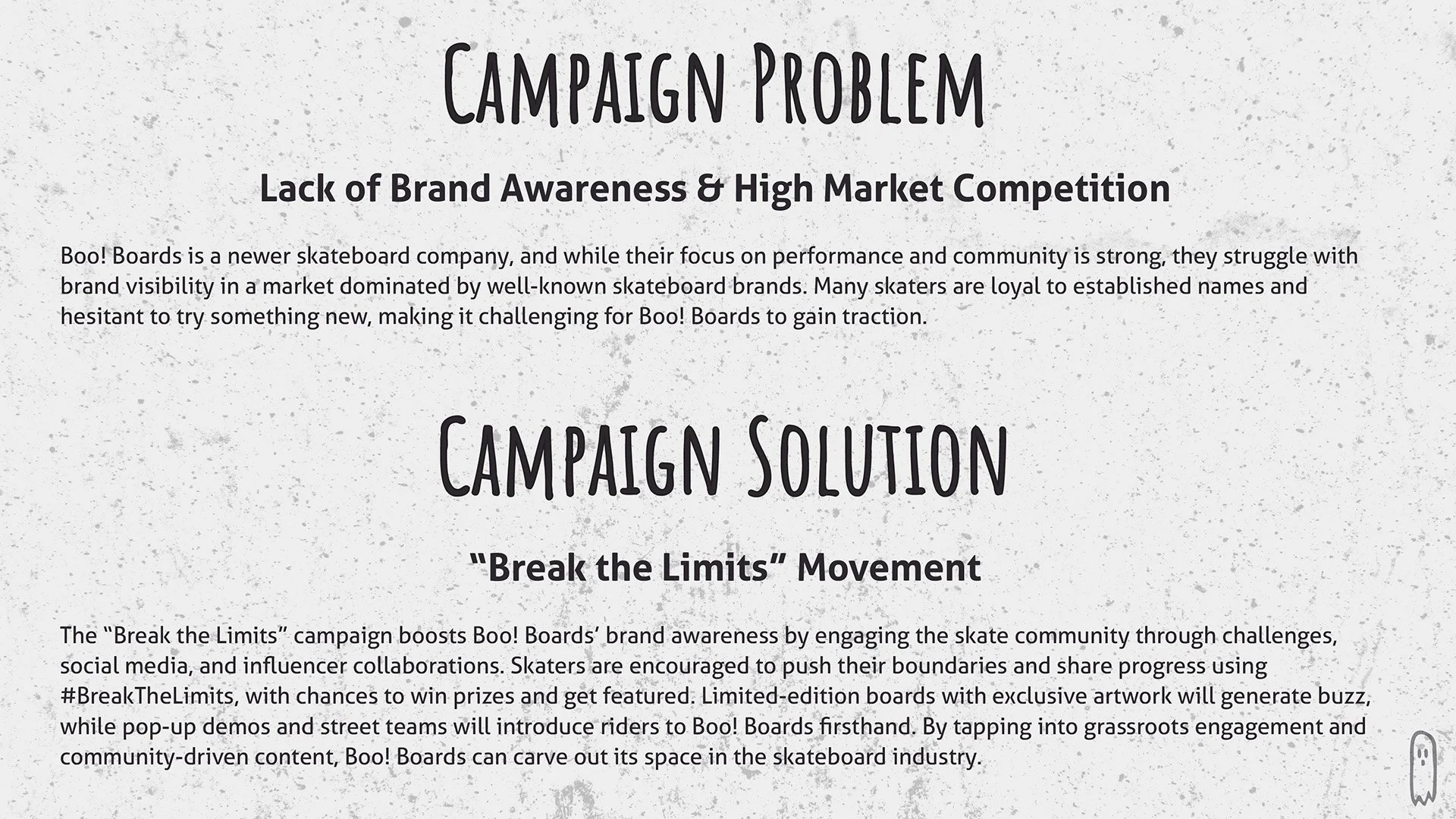 I created and designed the brand identity for the fictional brand, Boo! Boards. Next came a campaign to help bring awareness to the brand by creating a summer campaign called “Break the Limits” where I created a colour palette that would represent this campaign along with a slogan “No Limits. Just Skate.” This allowed me to create billboards, merch, social media posts and more to help promote their events and gear. In the end this also helped me create a promotional video (at the bottom) focusing on the “Break the Limits” campaign.